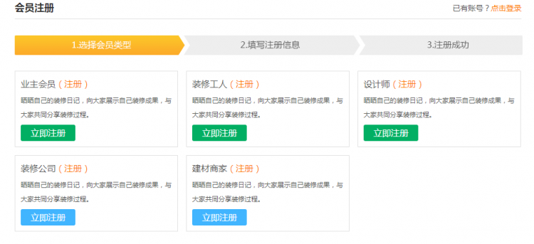 1、 在工裝之家裝修網首頁頂部點擊注冊按鈕或直接點擊右側注冊按“注冊”